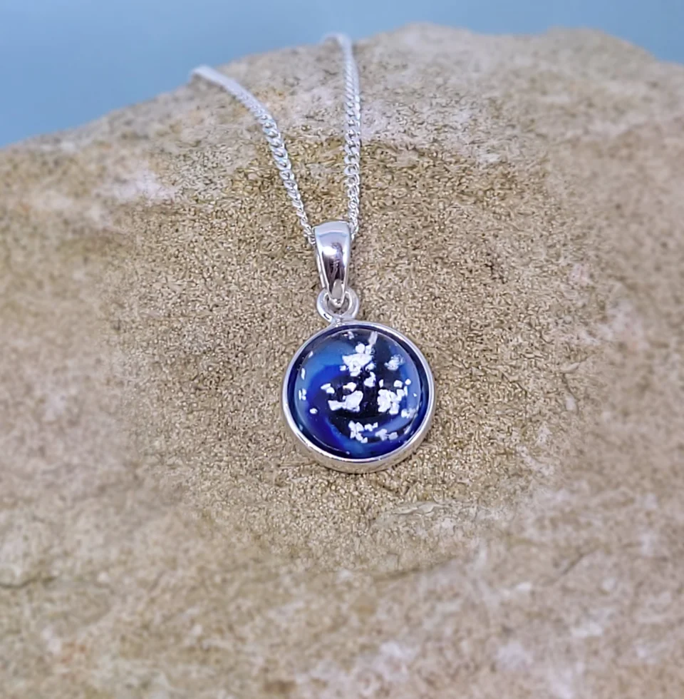 Stunning handcrafted glass set within a beautiful sterling silver Charm Pendant on a solid silver 18″ or 24″ curb chain necklace.