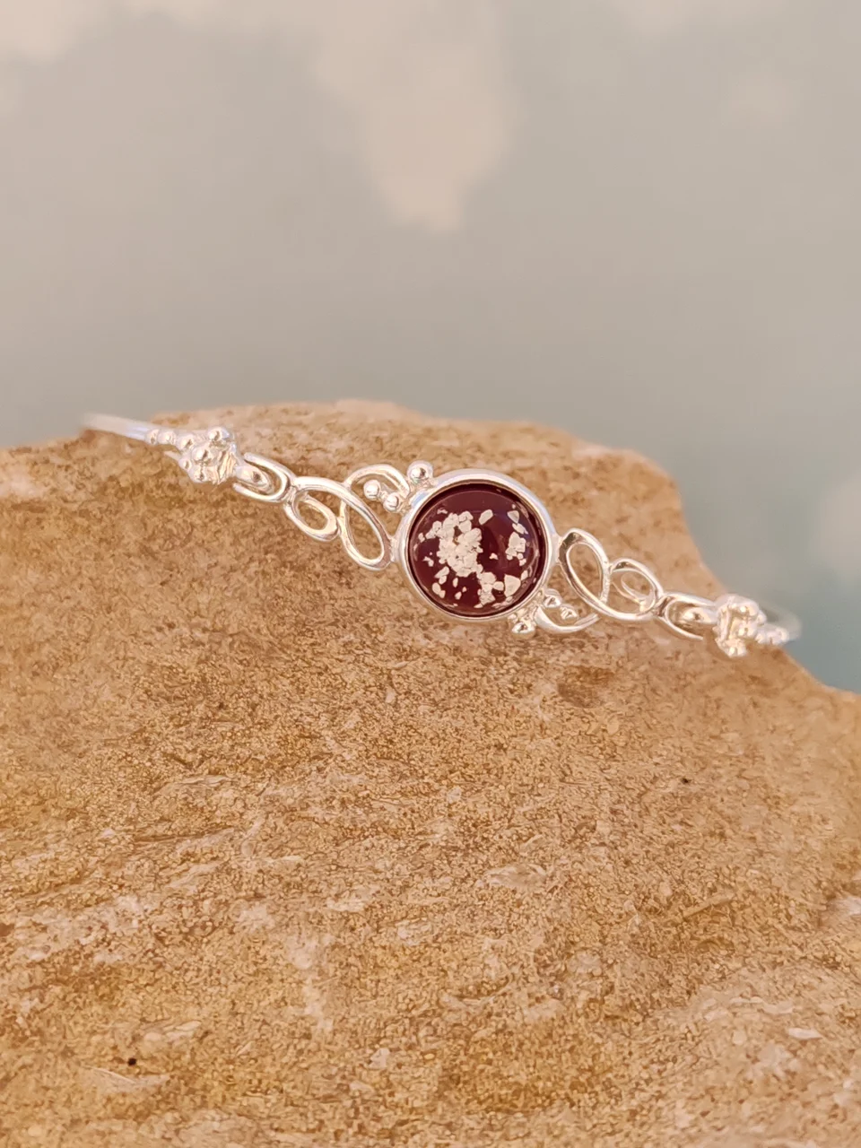 Stunning handcrafted glass set within a beautiful sterling silver Ornate Bangle.