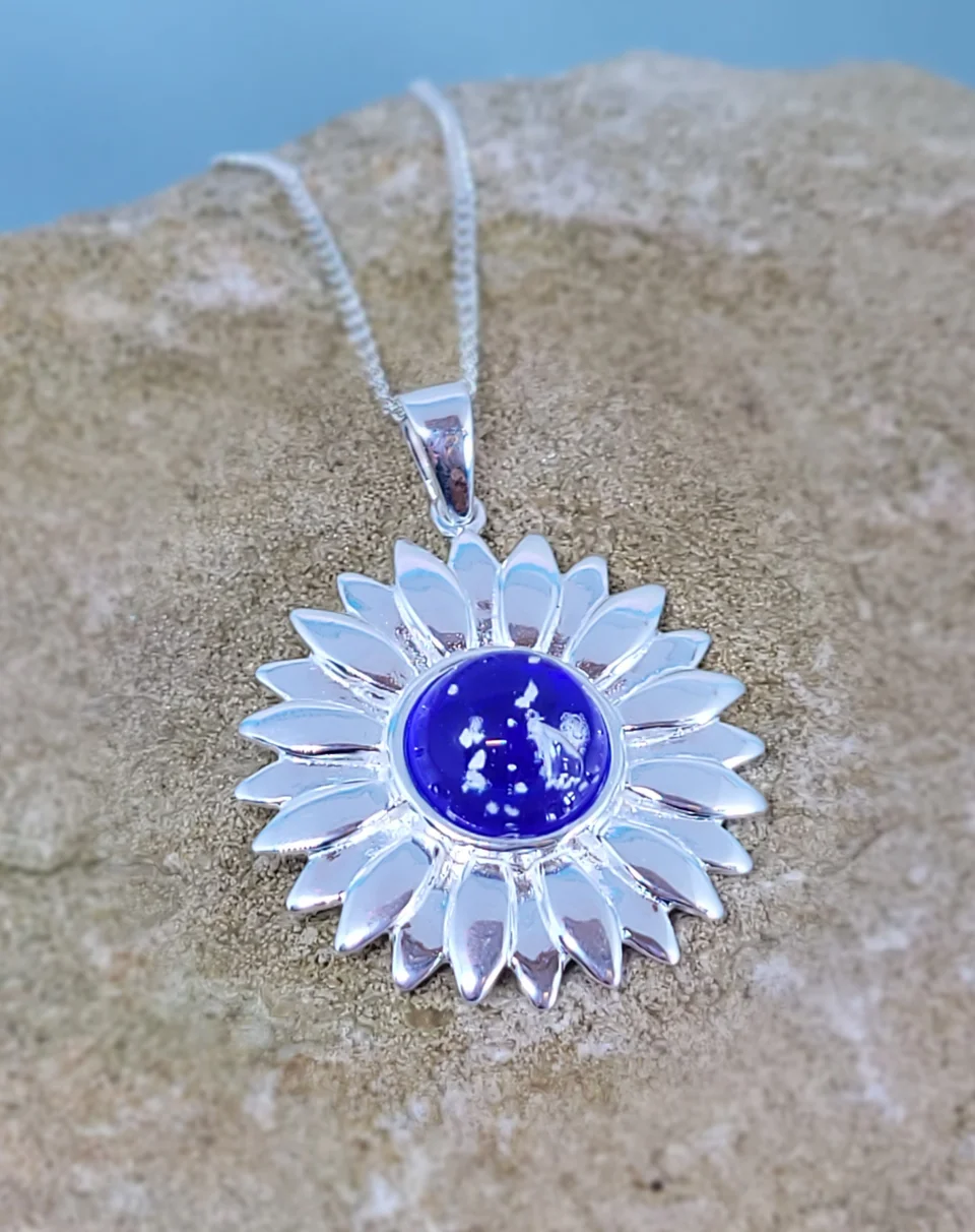 Stunning handcrafted sand/soil infused glass set within a beautiful sterling silver Sunflower Pendant on a solid silver 18″ curb chain necklace.