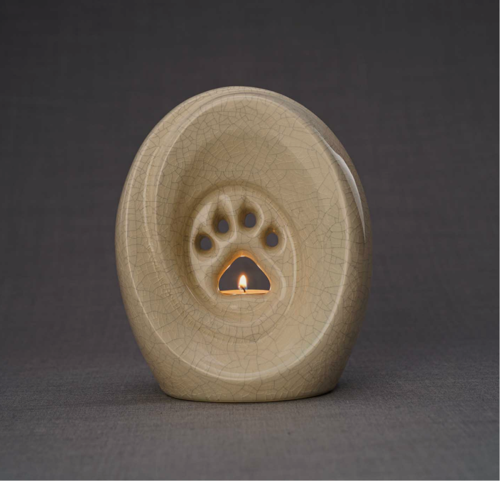 A refined ceramic urn from the Pulvis collection featuring a subtle paw-print motif and gentle glazing in craquelure or oily green finish. With space for the ashes and a built-in tea-light cavity, this urn offers tribute and ambience in one.