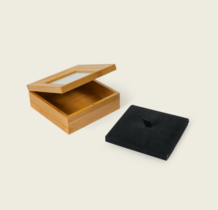 A simple, elegant bamboo photo-lid box with hidden ashes compartment (600 cc) and photo mount lid — perfect for keepsakes or smaller pets.